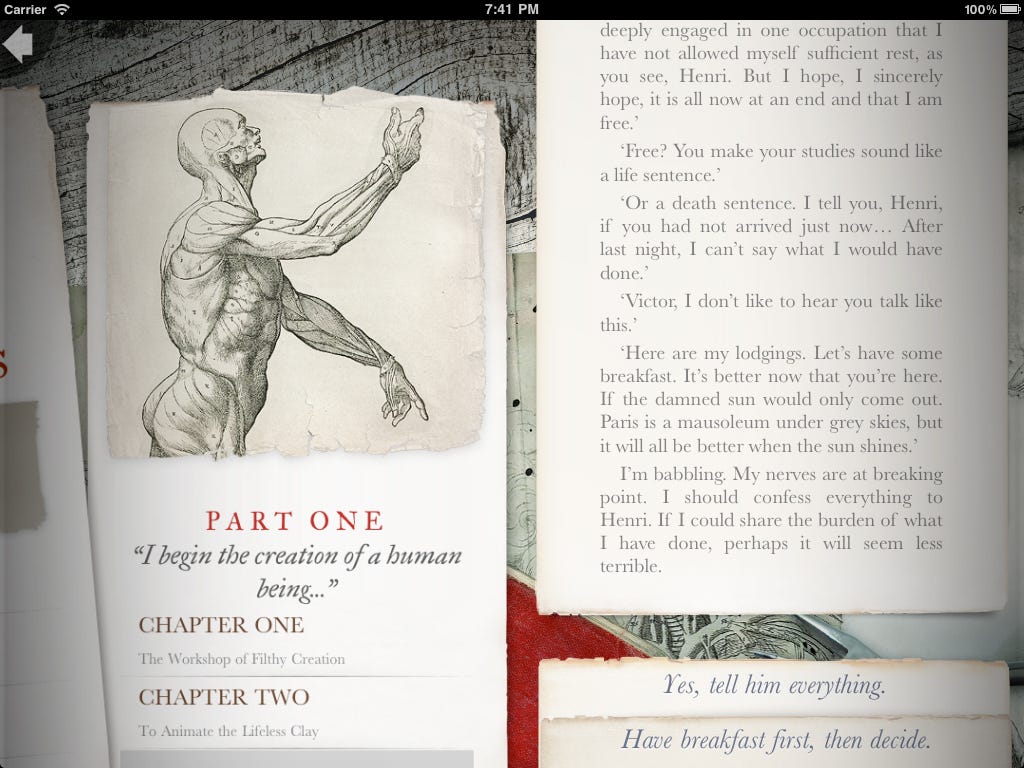 Under the hood, Frankenstein is still a lot like a gamebook. The iPad is crunching the numbers for you, so there's no need to roll dice and keep notes. But the big difference is the variables being tracked aren’t combat ability and hit points. They’re things like trust, guilt, pride, and alienation – the elements that make up our relationship with Victor and his monster.